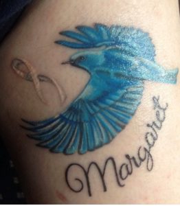 Yeah. So she was looking at these birds, so that was very important to her. So at the age of 76. A beautiful lady, a highly skilled lady, gave me a tattoo of my wife's name with a beautiful blue bird. She spent four hours doing it, and the bird is flying off and dropping a ribbon, a white ribbon, which represented lung cancer, freeing Margaret from her, her illness, and her pain and her sickness, dropping the the ribbon away.